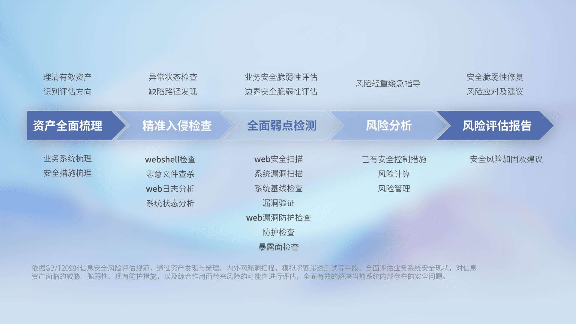 针对客户行业特性,,以专业的安全服务+多厂商联合解决方案提供专属的一站式安全管理服务,,,帮助客户全面感知网络空间威胁,,,,基于识别、、、、检测、、、、分析、、、防护、、监测、、、响应的服务理论模型,,,从方案咨询、、、、集成交付、、评估验证、、、、优化加固、、运维运营,,,致力于为客户提供完整的闭环管理式安全服务。。。以实战经验为客户打造高抵御风险的安全体系,,,帮助客户发现威胁、、、对抗威胁、、、处置威胁,,,不断积累安全对抗能力,,持续保障数字化安全。。
